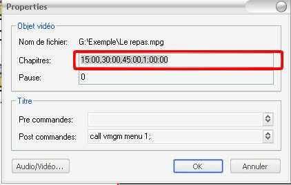 Par défaut la ligne chapitre est renseignée de cette façon : 15:00, 30:00, 45:00, 1:00:00 ce qui signifie que le deuxième chapitre se situe 15 minutes après le début, le troisième 30 minutes, etc. - Regardez votre vidéo et notez le temps à partir duquel commencera le deuxième chapitre.