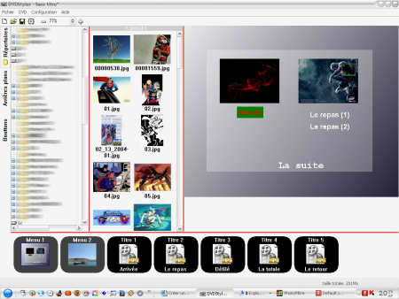 Réduisez le format de l’image avec le logiciel de votre choix (Xn View, Irfan View, Photofiltre voire the Gimp) : 200 x 150 pixels par exemple. - Insérez vos images dans votre menu à partir de la partie « Répertoire » de l’interface de DVD Styler.