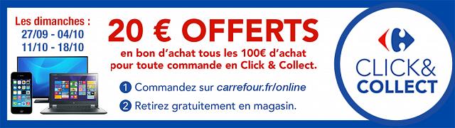 Dernier dimanche de l’offre carrefour 20€ par tranche de 100€ pour tout produit commandé en ligne et livré dans votre hypermarché (Clic and Collect).
