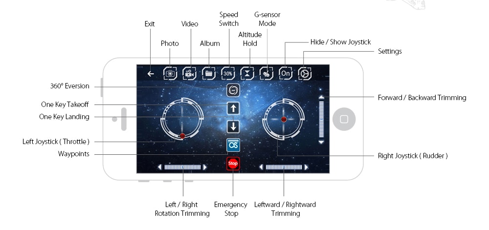 Ce mini drone pas cher se pilote via votre Smartphone en mode télécommande ou gyroscope en wifi. la porté est de l’ordre de 40 mètres. Un mode carte permet de dessiner la trajectoire et le point d’arrivé désiré. Le mini drone peut exécuter des figures à 360°.