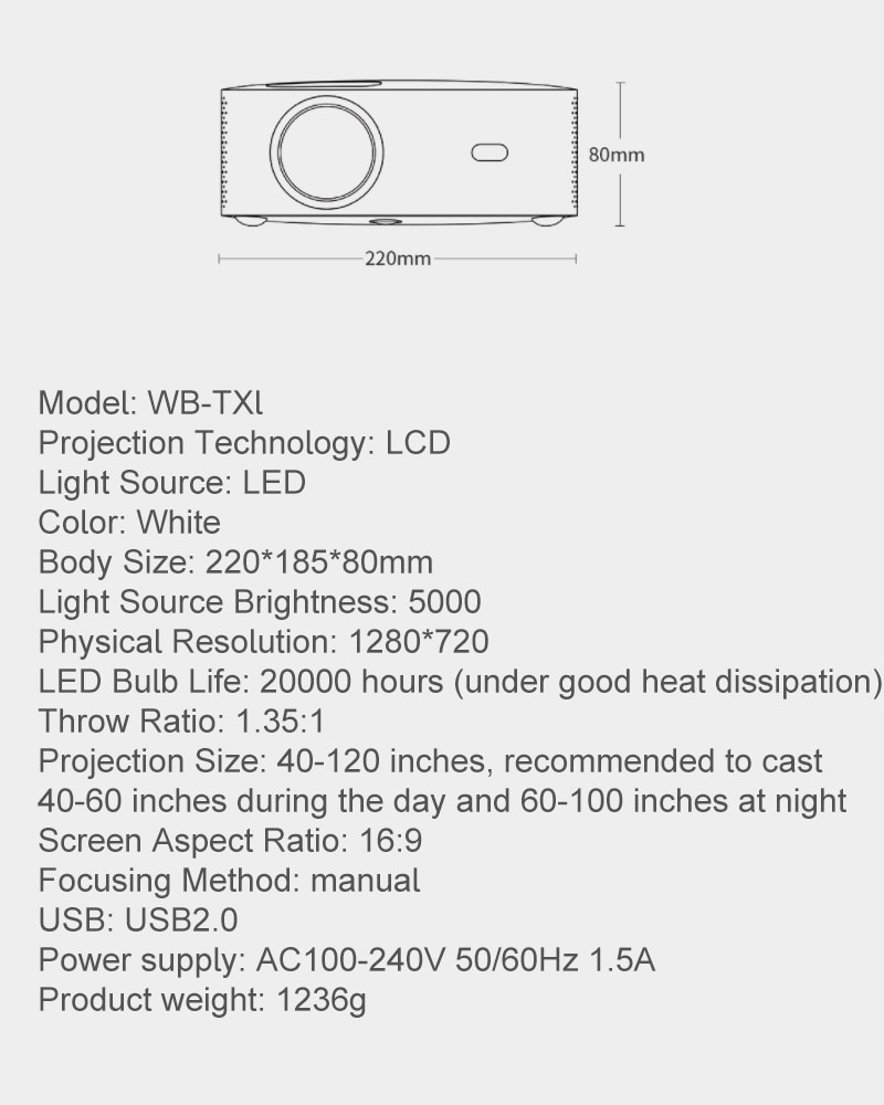 La luminosité indiquée est de 5000 lumens « Chinois » ce qui doit correspondre à 200-250 lumens Ansi comme à l’habitude. La source de lumière est une LED ce qui rassure sur la longévité du produit (jusque 20000 heures).
