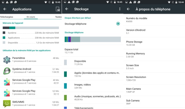 Au niveau RAM, il reste 1,1 GO une fois le Smartphone lancé ce qui est moins bien que le K4000 qui libère 1,5 Go.