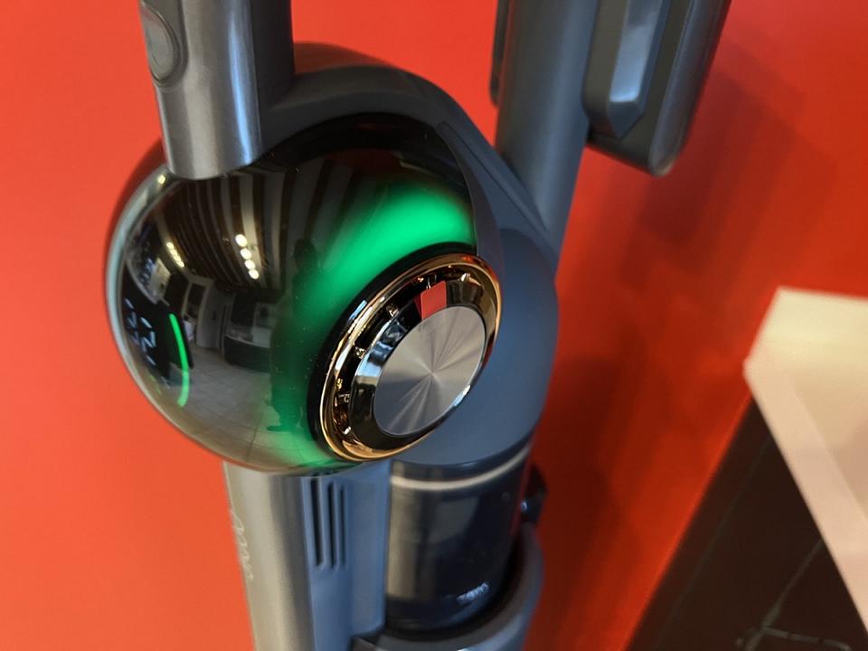 À l’arrière du bloc aspirateur se trouve une sphère. Elle intègre de belle façon l’écran d’affichage. Il y est indiqué le niveau de charge de la batterie, le mode de puissance et les éventuelles erreurs (brosse bloquée par exemple).