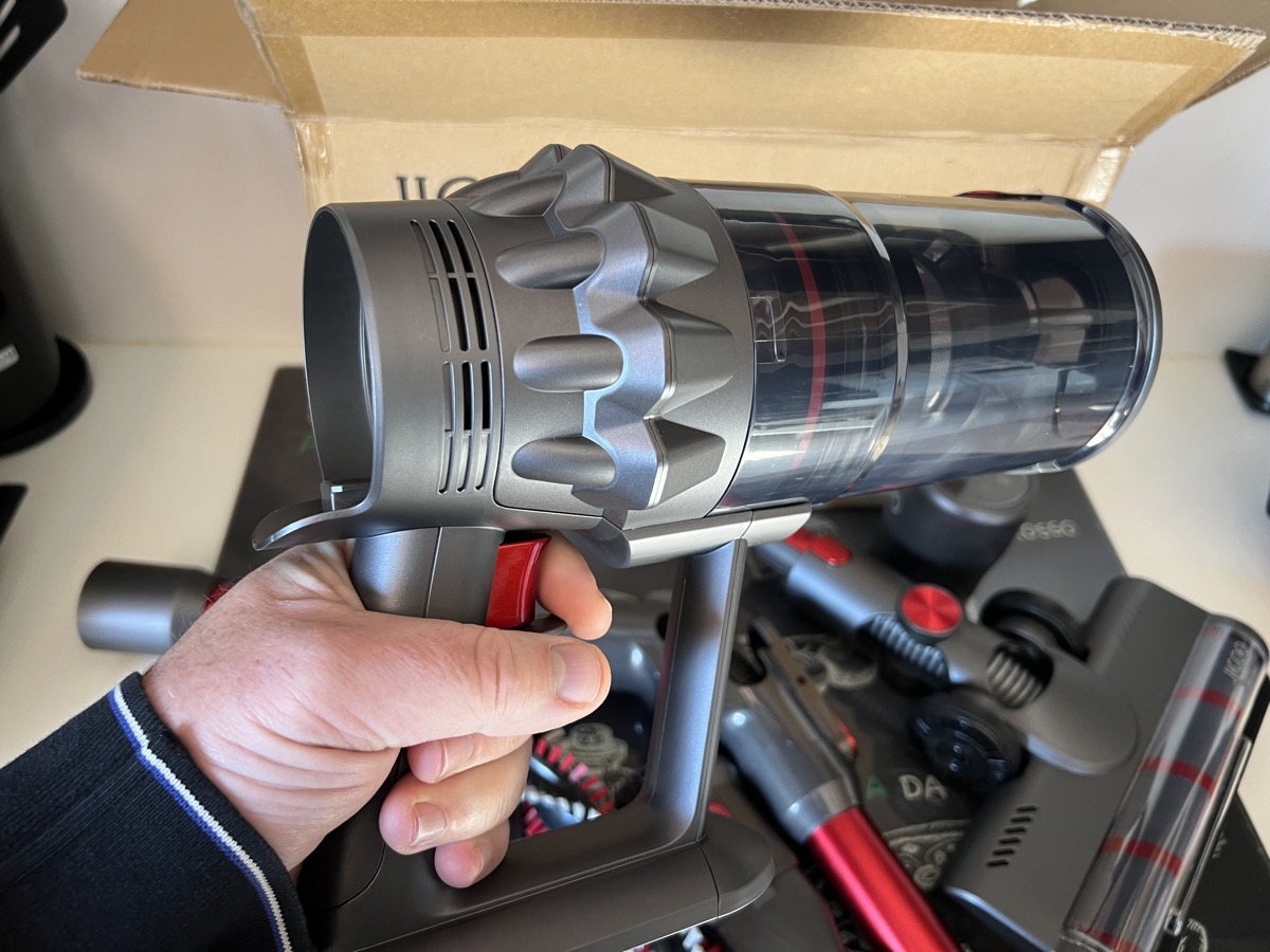 Le collecteur de poussière et le système de filtration sont bien visibles à l’avant. Il s’agit d’un système cyclonique avec filtre métallique et filtre Hepa.