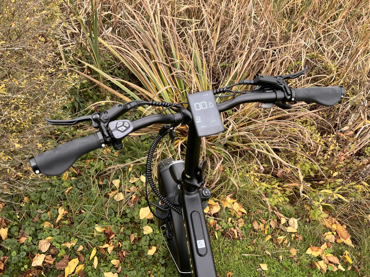 La position générale sur le vélo est bien droite, ce qui limite le stress au niveau du dos. Le guidon large est ergonomique, avec des poignées en silicone également ergonomiques.