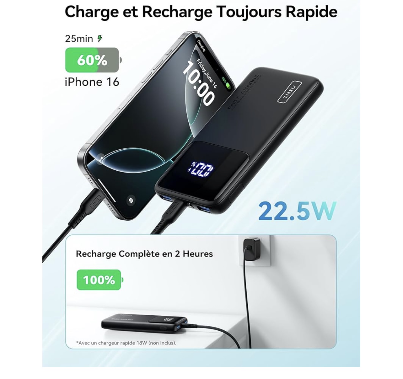 La Batterie externe 10000mAh 22,5W Iniu à 10,75€