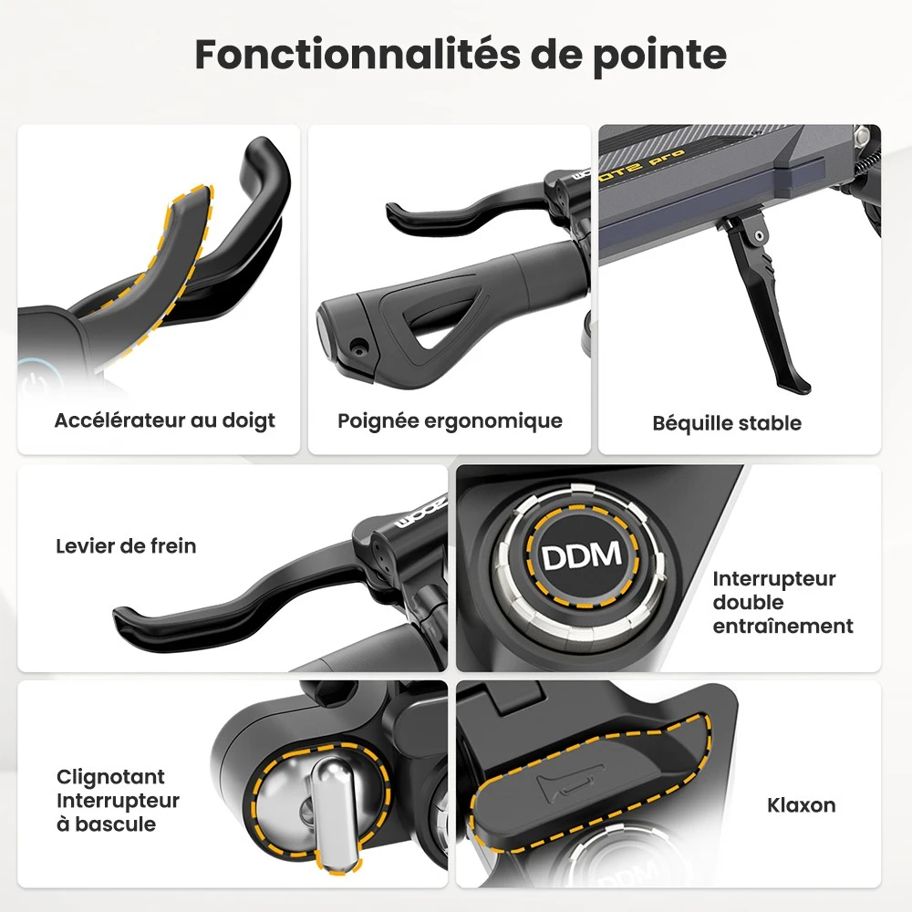 Niveau conception, la trottinette DT2 Pro est équipée d’une suspension à double bras oscillant avec ses pneus sans chambre de 10×3 pouces essentiels pour éviter les crevaisons.