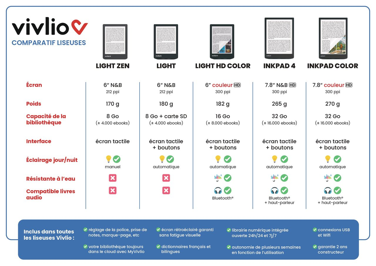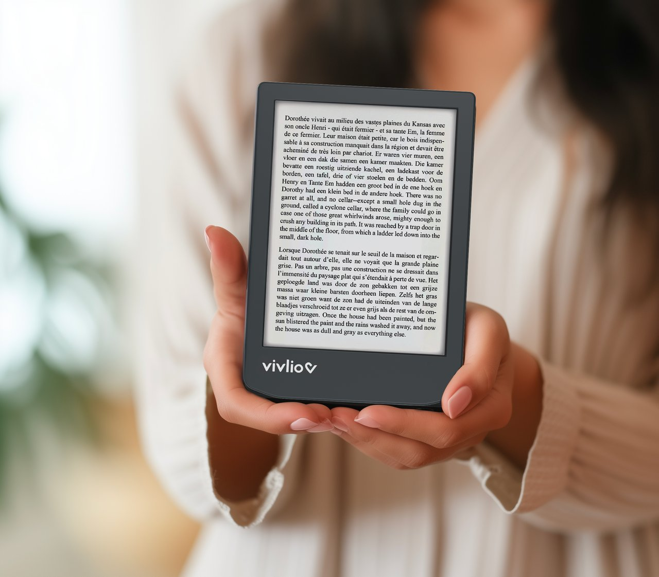 Il s’agit d’une liseuse eBook française compacte de 6 pouces, idéale pour une lecture nomade sans distractions, avec un écran E Ink Carta noir et blanc de 758 × 1024 pixels (212 ppi) anti-reflets et rétroéclairé. Elle pèse seulement 170 g, mesure 156 × 108 × 7,6 mm, et offre 8 Go de stockage pour environ 4000 eBooks, une autonomie d’un mois, Wi-Fi 2,4 GHz et USB-C.