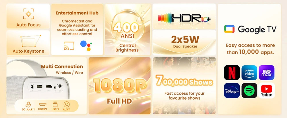 Avec ce projecteur, vous allez pouvoir profiter de streaming et home cinéma complète avec accès direct à Netflix, YouTube, Prime Video et Disney+, sans devoir investir dans un système audio/vidéo externe ou ajouter un boîtier Android TV.