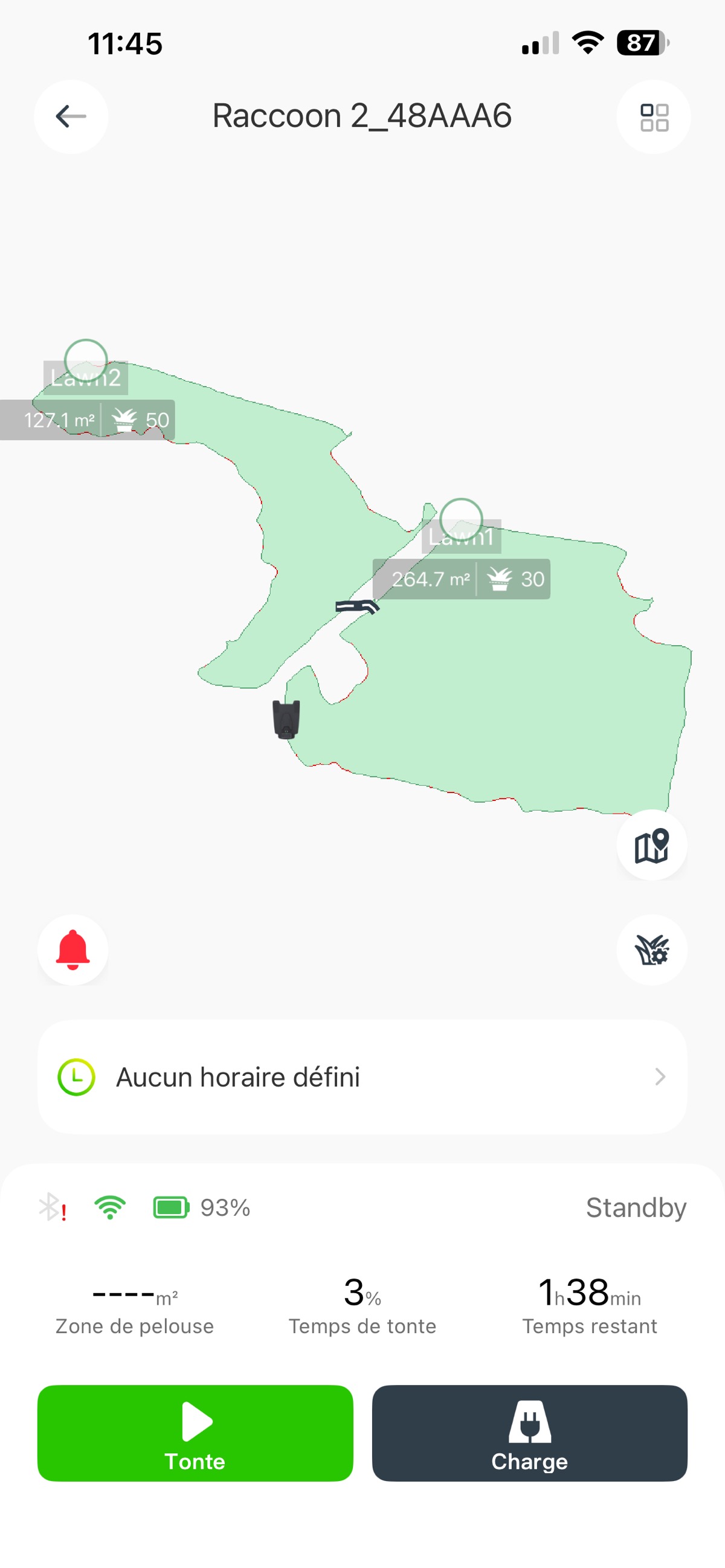 C’est naturellement à nuancer. Ce mode sans carte est actuellement limité à une surface de 80 m² donc de très petits jardins. Le robot Raccoon2 SE peut évidemment tondre plus, en théorie jusqu’à 500 m², De manière plus réaliste, il sera plus à l’aise sous les 250 m². Avec une charge, il offre 150 min d’autonomie.