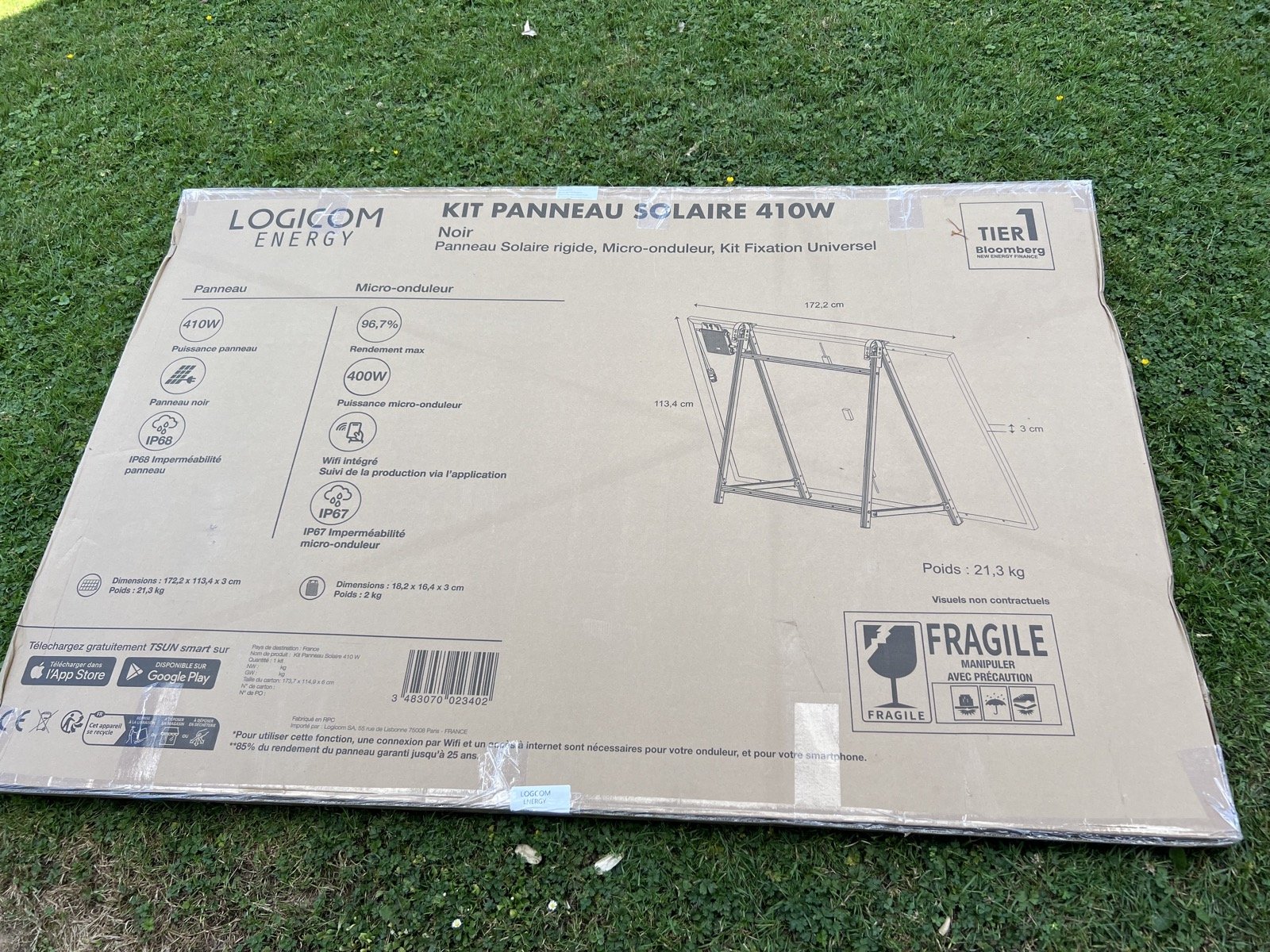 Le kit en question est signé Logicom. Il se compose d’un panneau photovoltaïque 420 W, d’un micro onduleur TSUN, wifi standard, d’un système de support universel, permettant tout aussi bien de le placer au sol, au mur ou sur un balcon et d’un câble 10 mètres.