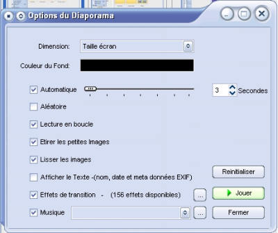 L’un des intérêts d’Image Viewer est de pouvoir lancer un diaporama de vos photos. Les paramètres que vous pourrez choisir sont simples mais permettent de créer une présentation soignée et efficace. Les options seront appliquées à l’ensemble du diaporama et non image par image et les effets de transition sont très standard (ne comptez pas sur des effets 3D) même si ils sont nombreux (156 effets possibles). Et comme un diaporama n’en serait pas véritablement un sans musique, vous pouvez ajouter plusieurs de vos morceaux préférés à vos clichés (WMA, WAV, MIDI, MID et heureusement MP3).