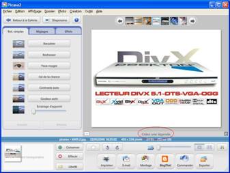 Là ou google va plus loin, c’est le système de renseignement des photos. En effet, on peut donner pour chaque photo une légende par le centre de retouches (double clic sur une photo ou, Ctrl+3 ou, Menu affichage -> Centre de retouche)