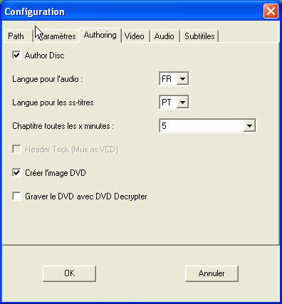 L’onglet Authoring permet de sélectionner les paramètres de création du disque final.