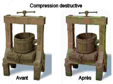 - Destructive : le nombre d’information est réduit plus ou moins lors de la phase de compression : par exemple des couleurs proches sont traduites par une même valeur. La compression est plus ou moins sensible à l’œil ou à l’oreille car elle consiste à détruire en priorité des éléments non perceptibles.