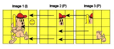 - les images P Prédictives qui se servent également de parties de l’image précédente et se contentent dès lors de n’enregistrer que leur déplacement avec une valeur dite « d’erreur ».