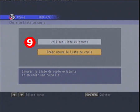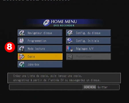 Appelez sur le menu de l’enregistreur la fonction copie vers un disque DVD (8) .