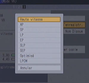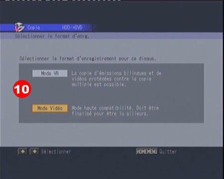 Choisissez le mode vidéo. VR est un mode spécial crée pour les enregistreurs de salon. Il permettra une édition ultérieure sur un PC ou l’enregistreur (10) mais sera peut être impossible à lire sur un autre lecteur de salon.
