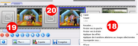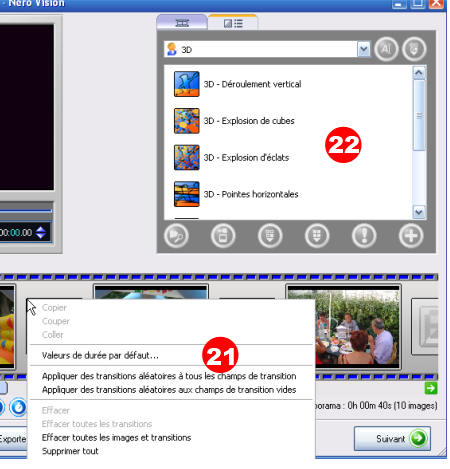 - Pour ajouter une transition, cliquez entre chaque photo (20) puis choisissez dans le menu contextuel des transitions aléatoires (21) ou une particulière (22)