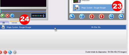 Cliquez sur un fichier audio (23) dans le navigateur de fichier puis faite-le glisser sur le plan de montage dans l’onglet audio (24).