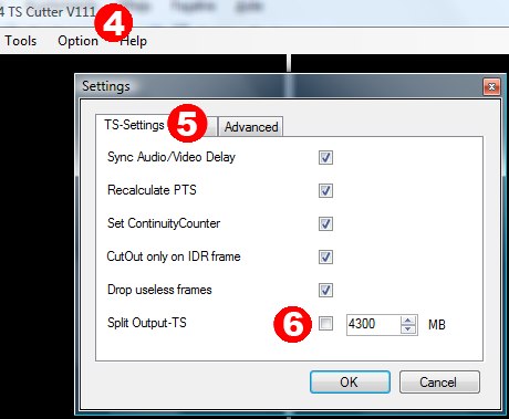 - L’onglet TS-Settings (5), permet de spécifier une taille maximale de fichier (6). Le logiciel créera automatiquement plusieurs tronçons en cas de dépassement.