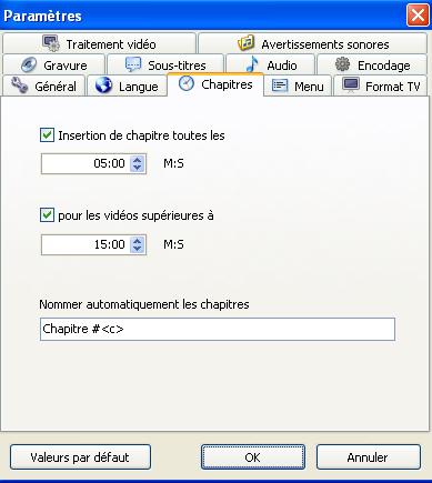Par défaut, ConvertXtoDVD positionnera un chapitre toutes les 5 minutes dans les vidéos de plus de 15 mn. Le nom « chapitre » suivi du numéro sera utilisé sur les menus.
