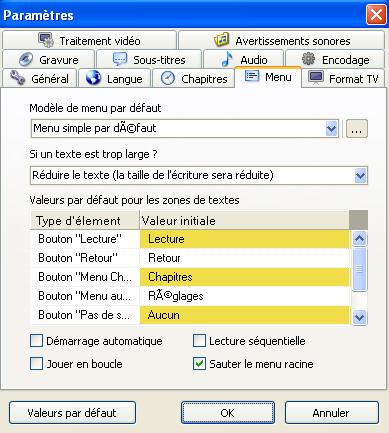 Comme nous l’avons vu précédemment, il est possible de modifier l’apparence du DVD final en termes de menu mais aussi d’interactivité générale (démarrage automatique, lecture séquentielle, …). Vous pouvez spécifier ici le comportement par défaut.