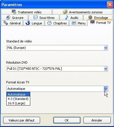 Cet onglet permet de régler le format vidéo et le type de standard TV (Pal ou Ntsc). Vous pouvez forcer le type de résolution compatible DVD souhaitée ou laisser le logiciel choisir celle la plus adaptée en raison de la durée de la vidéo. Le choix Broadcast D1 est notre préféré. Il garanti pour des DVD de moins de 3 heures le meilleur rendu.