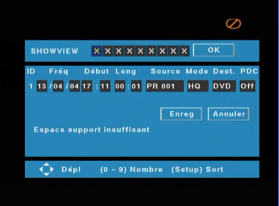 La programmation d’enregistrement est basique (total de 8 événements, jusqu’à un moins à l’avance) mais simple à comprendre. Elle est également compatible Showview et le code relevé sur votre magazine TV permettra de programmer juste par une séquence de chiffre votre enregistrement.