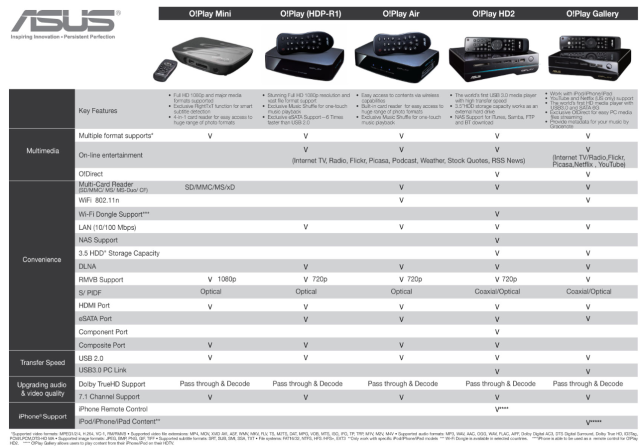 Asus a une gamme de lecteurs multimédia et le Gallery se positionne dans le haut de gamme. En regard du dernier O !Play HD2, il gagne le support iPhone, le Wifi mais il perd la fonction NAS. Etrange car cette fonction ne coûte rien à mettre en œuvre.