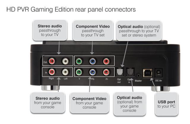 Le HD PVR GAMING EDITION est muni d’entrées composante. Il n’y a toujours pas d’entrée HDMI . Le boîtier encode la vidéo en MPEG-4 AVC H.264. Côté audio il propose des entrées audio numérique coaxiale et optique. Par cette dernière entrée, l’encodage en Dolby Digital 5.1 est possible.