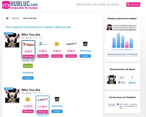 Voici donc là où intervient le nouveau moteur de comparaison de musique Hubluc. Tapez le nom de la musique ou de l’artiste recherché et tout comme un moteur de recherche de prix classique, vous trouverez le meilleur prix.