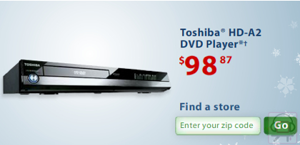 Aujourd’hui uniquement chez Wal-Mart, un équivalent de nos hypermarchés, le lecteur HD-A2 Toshiba sera proposé au prix riquiqui de 98 € 87.