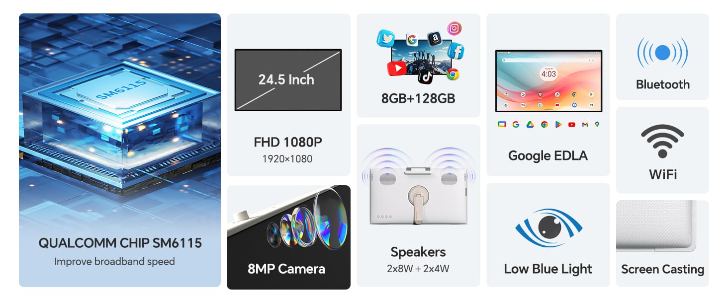 Il faut plus parler d’une tablette que d’un simple écran. L’appareil tourne avec Android 14 officiel. Il est animé d’un processeur Qualcomm SM6115 et d’un GPU Adreno 610 avec 8 Go RAM et 128 Go de stockage extensible.