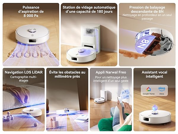 Le Narwal Freo S embarque un moteur délivrant une puissance d’aspiration très forte de 8000 Pa. Grâce à ses quatre modes de nettoyage, il s’adapte aux différentes surfaces et peut gérer aussi bien la poussière fine que les poils d’animaux ou les miettes.