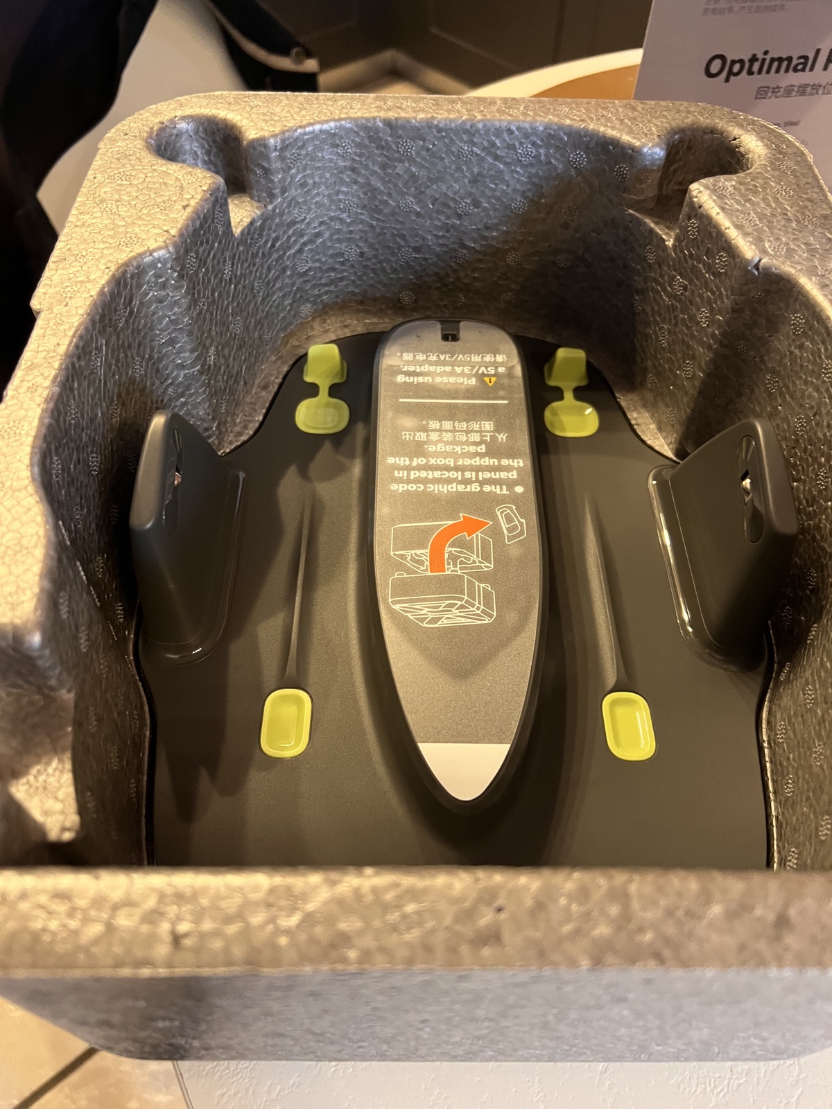 L’emballage en polystyrène gris protège le robot et sa base de charge. Le kit inclut une balle en carton à assembler et un chiffon rouge pour jouer à la corrida.