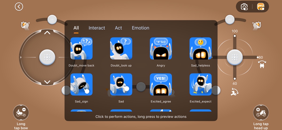 Une série de gestes est aussi interprétée : une main projetée vers lui lui fait peur ; un pouce en l’air, et il fait de même par un mouvement avec un +1 à l’écran.