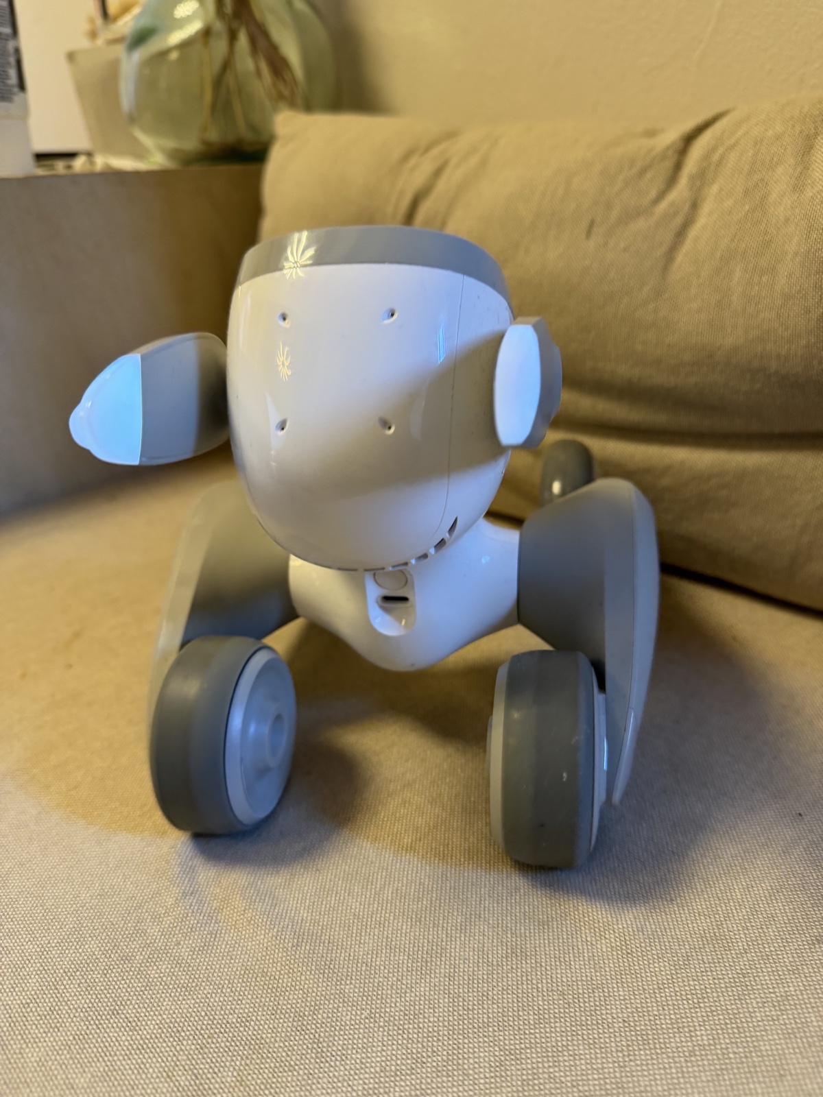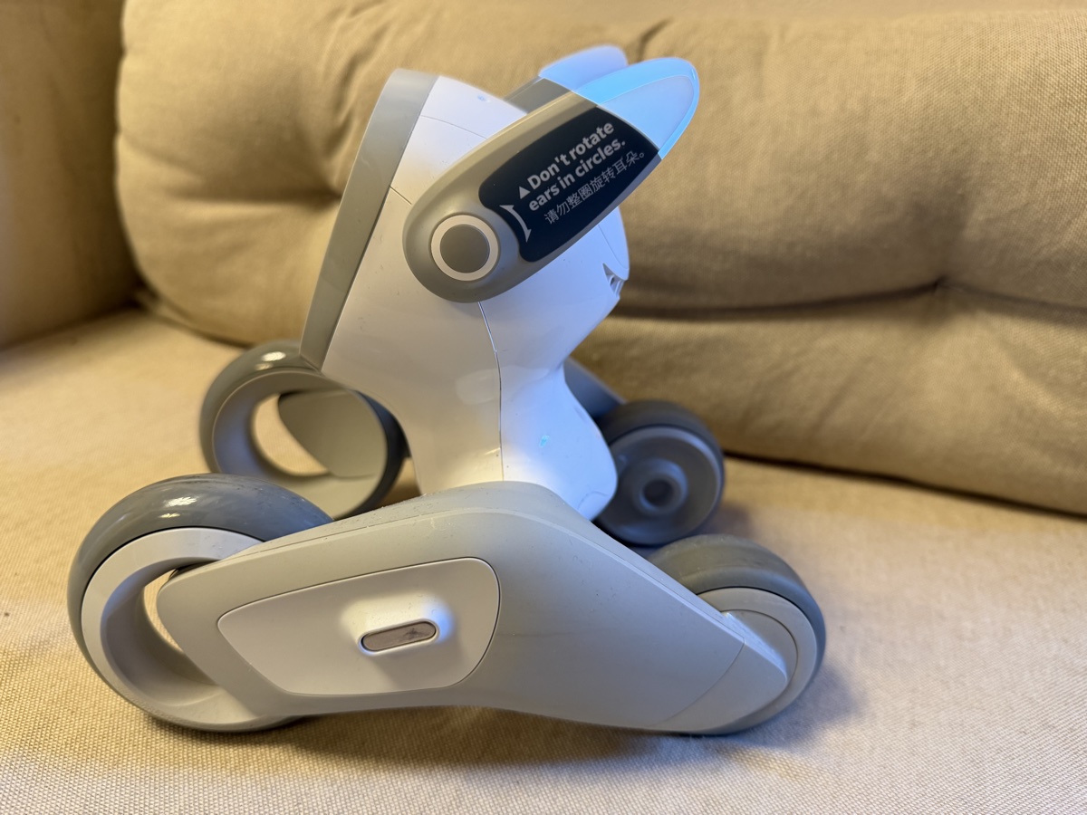 Le design évoque un vrai animal : tête avec écran haute résolution pour émotions, oreilles articulées et lumineuses. Le corps en plastique haut de gamme roule sur quatre roulettes avant/arrière pour une mobilité rapide.