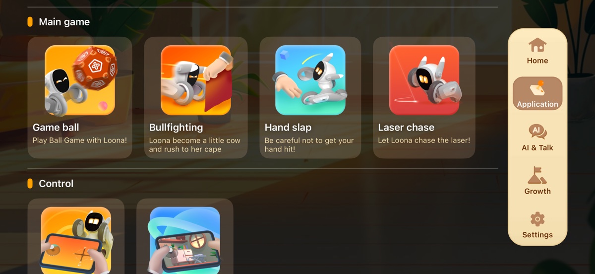 La section jeux inclut un mode télécommande pour piloter Loona manuellement via sa caméra embarquée. Contrôle à distance par Internet possible.