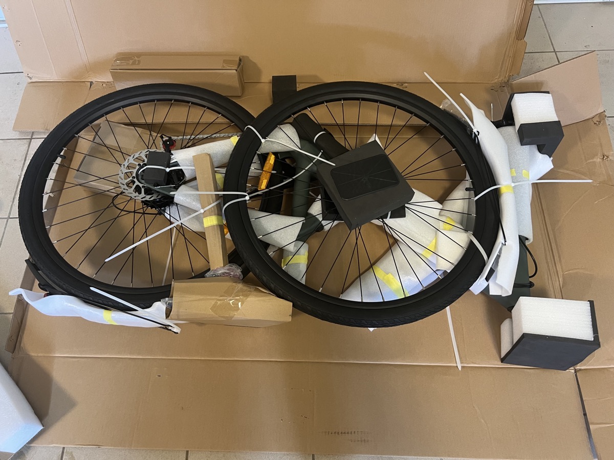 Le vélo ENGWE voyage bien calé dans de la mousse avec chaque pièce protégée par du carton sans excès.