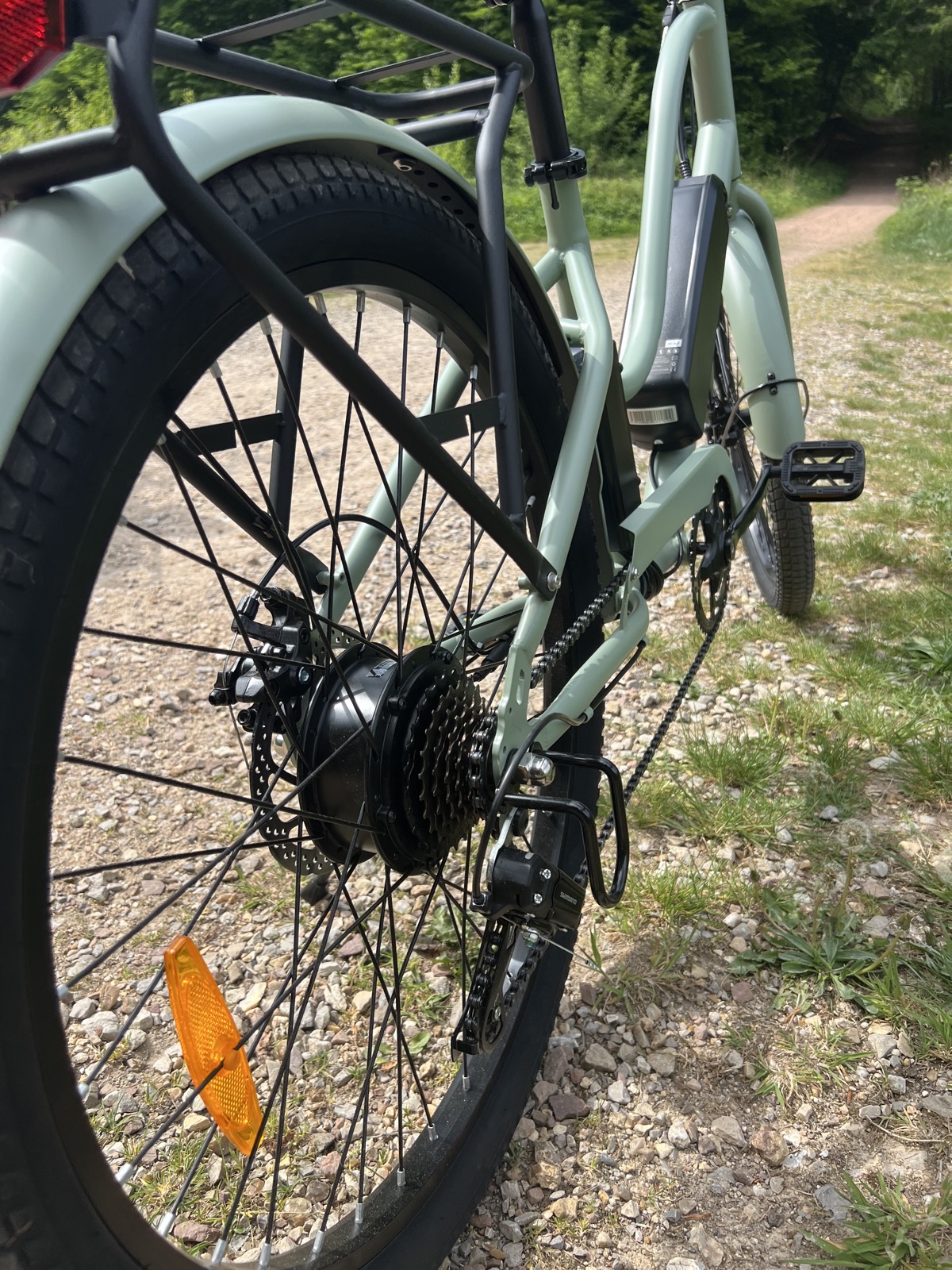 Côté look et confort, il est bien avec son cadre sympathique, son porte-bagages et ses garde-boue. Les composants sont d’entrée de gamme sans être de mauvaise qualité.