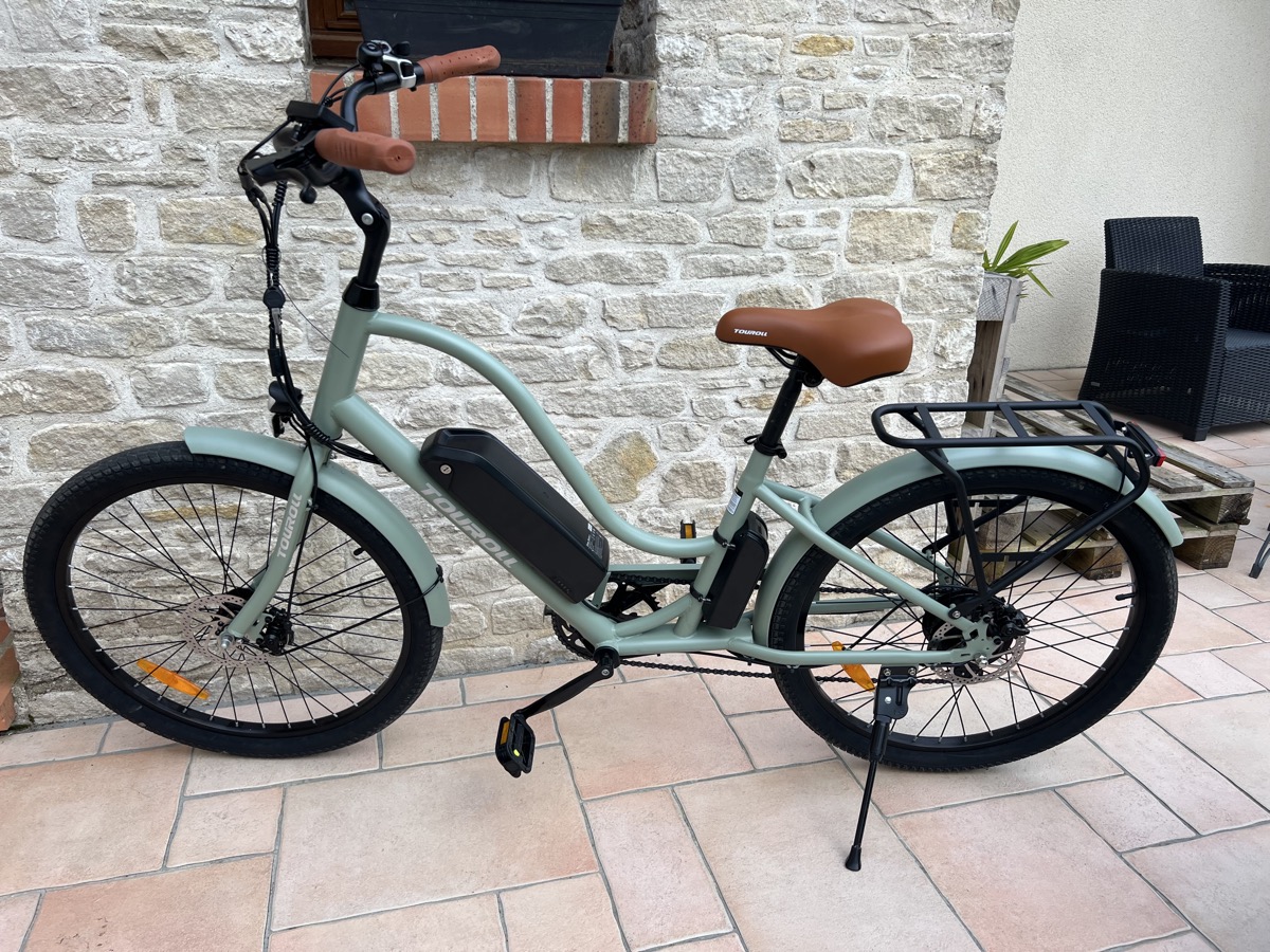 Le Touroll B2 City, que je vous teste ici, est le tout dernier modèle de la marque. Il a été pensé pour concilier esthétisme et tarif très doux, avec son cadre vintage type hollandais vert d’eau, ses poignées et sa selle marron, le tout sans faire de compromis majeurs sur les performances, notamment la batterie ou la qualité.