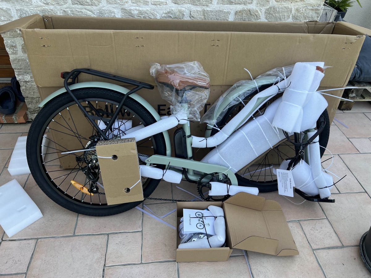 Le vélo Touroll B2 City arrive quasiment entièrement assemblé et bien protégé, sans risque de choc. Touroll a visiblement fait un réel effort pour limiter l’usage de mousse et réduire les déchets d’emballage, une initiative appréciable sur le plan environnemental.