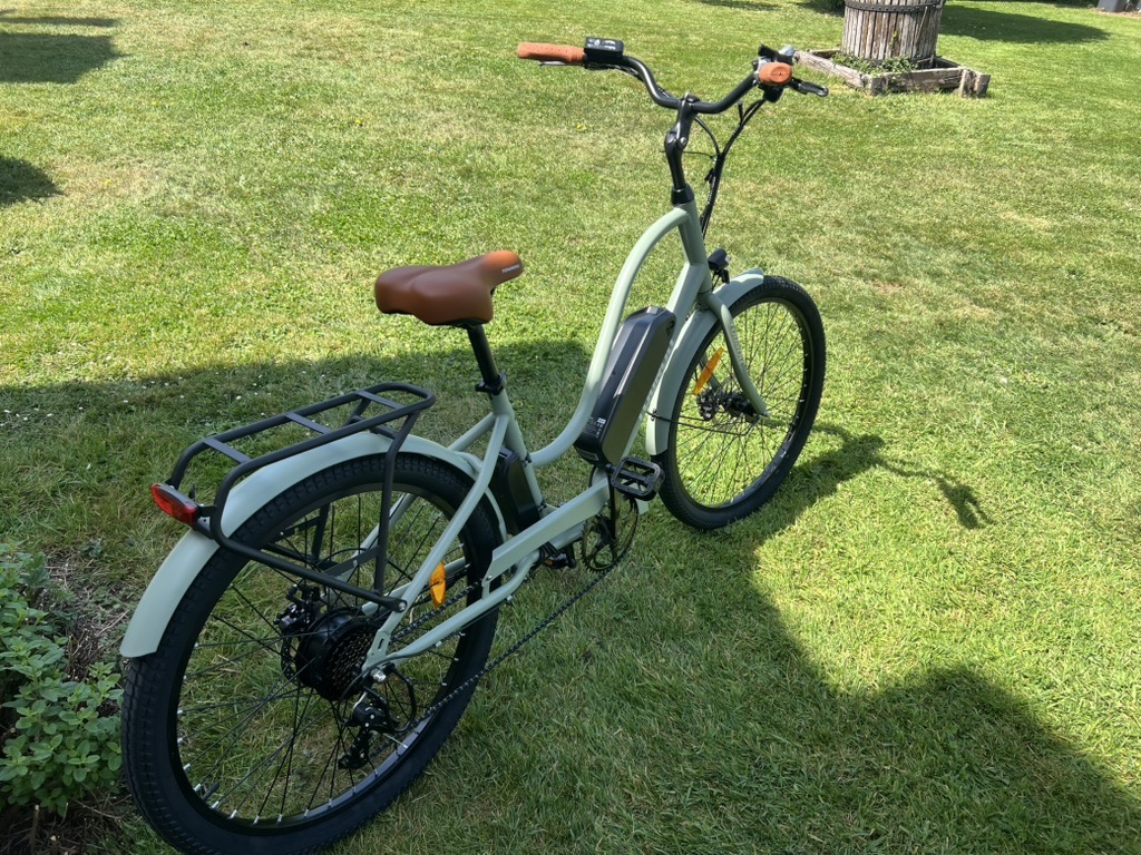 Les couleurs, vert d’eau pour le cadre, marron côté selle et poignées, noire pour les autres composants, lui donnent un look qui plait beaucoup.