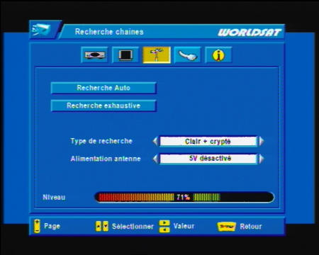 Après 3 questions (Sélection de la langue, Choix du pays, Niveau parental souhaité), la recherche des canaux démarre. Très rapide, elle prend moins de 2 minutes.
