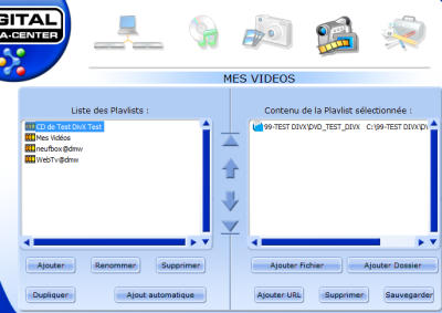Les autres onglets permettent de définir les médias à partager sur votre DDREAM. Il est possible de créer des listes de lecture virtuelle puis d’y faire glisser les fichiers individuellement ou par répertoire. Ce mode de fonctionnement est classique.