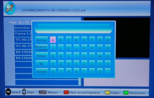 L’accès à la liste des enregistrements est direct via une touche de la télécommande. Les noms des enregistrements sont crées et triés avec le nom de la chaine, la date et l’heure. Il est possible alors de supprimer ou renommer une enregistrement. Avoir de trops nombreux enregistrements sera par contre difficile à gérer.