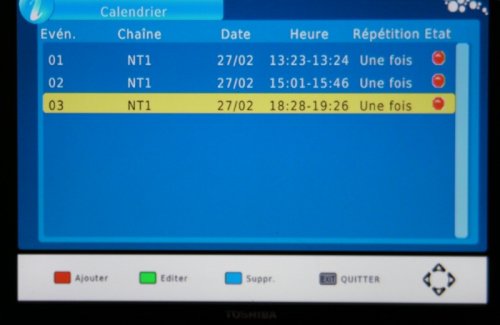Une touche de la télécommande permet d’entrer dans la gestion du calendrier pour ajouter/supprimer ou éditer des fiches. Il faudra se souvenir quel est le nom du programme enregistre dans la mesure ou il n’apparait pas dans l’écran.