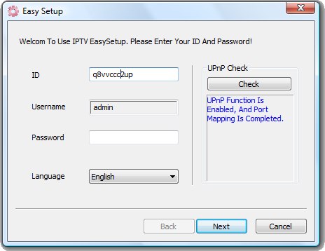 - Le premier écran vous demande l’identifiant de votre TV-BOX ainsi que le mot de passe. Ceux-ci sont inscrits sur la pochette du CD. Il est conseillé de vérifier que la fonction UPNP de votre routeur est activée. Par cette fonction l’appareil sera directement découvert sur le réseau.