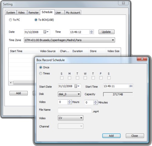 - L’onglet Schedule permet la programmation d’enregistrements. Les éléments demandés sont habituels si ce n’est le choix de la destination de l’enregistrement, ordinateur ou port USB.